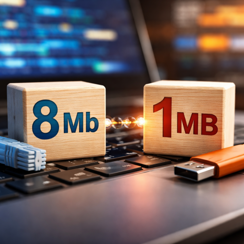 Швидкість інтернету — 100 мегабіт, розмір файлу — 12 мегабайт. Здається, цифри схожі, але порівнювати їх напряму — все одно що міряти відстань у кілограмах. Плутанина між цими двома одиницями щодня коштує людям нервів: хтось дивується, чому скачування «гальмує» навіть на «швидкому» тарифі, хтось помиляється при виборі флешки або хмарного сховища. Тож розберімось раз і назавжди.