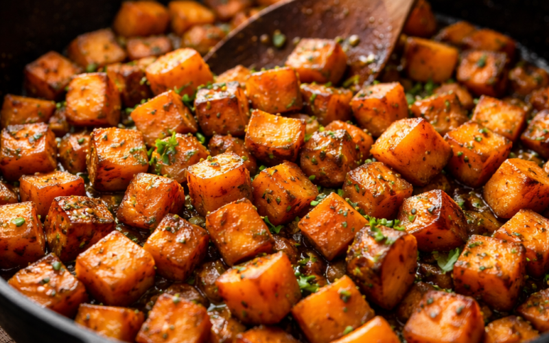 Смажений батат — це повноцінний гарнір, закуска або навіть основа для простої страви. Він добре поєднується з курячим філе, смаженою рибою, яйцями (особливо яєчнею або пашот), а також стає чудовим компонентом у теплих овочевих салатах.