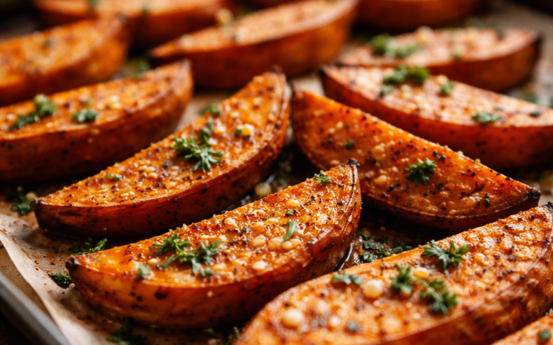 - Не перевантажуйте деко. Якщо шматочки лежать надто щільно, вони парюються, а не запікаються — і ніякої карамелізації не буде.