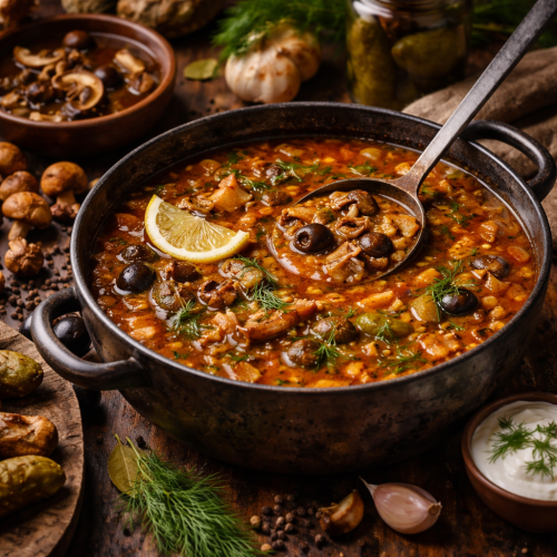 Грибна солянка — це про баланс. Між кислим і насиченим, між м’якою текстурою грибів і пружністю маслин, між димним ароматом сушених грибів і свіжістю огіркового розсолу. Жоден з цих елементів не має домінувати повністю — вони мають працювати разом.