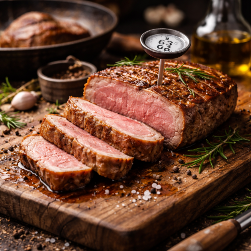 Для відрубів на кшталт корейки або ескалопу підходить класичний ресторанний прийом: обсмажити на сильному вогні по 2–3 хвилини з кожного боку до рум’яної скоринки, а потім довести до готовності в духовці при 160°C ще 10–15 хвилин. Скоринка запечатує соки, і м’ясо залишається ніжним усередині.